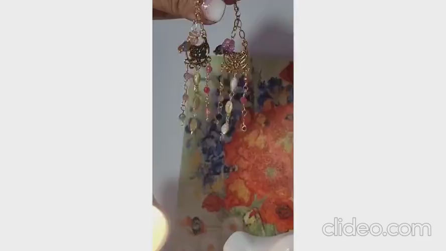 If you're searching for gemstone earrings that blend elegance with artistic flair, these boho chandelier earrings are the perfect choice. These dangle earrings feature a stunning mix of natural tourmaline gemstones, luminous mother-of-pearl accents, and vibrant hand-crafted lampwork glass beads. The intricate brass crescent design and 14k gold-plated details add a luxurious touch.