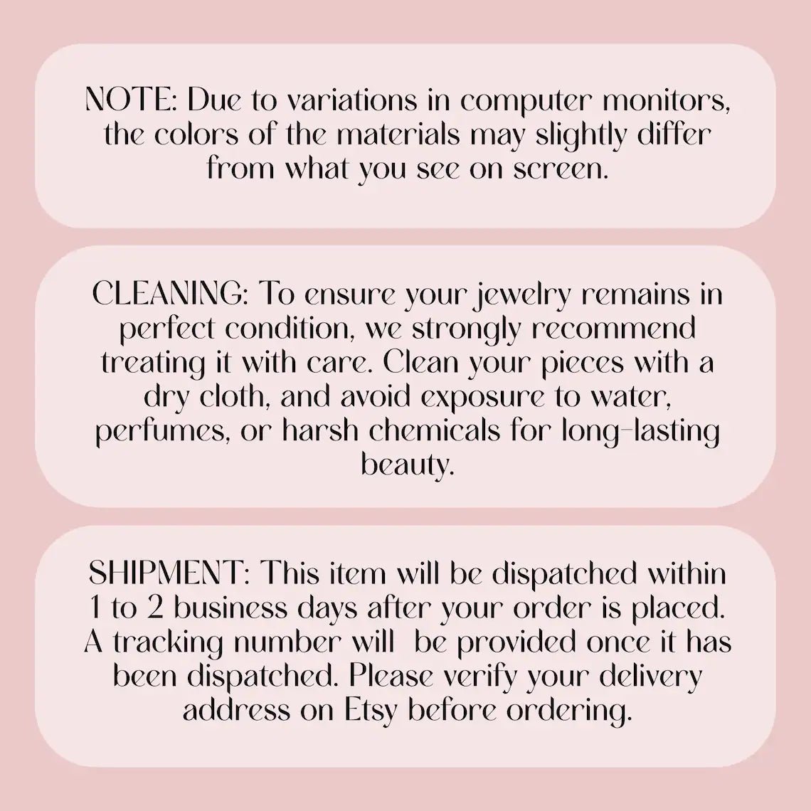 NOTE: Due to differences in computer monitors, printed colours may differ slightly to those shown on screen. Strongly recommend your jewellery in perfect condition by treating them with care, cleaning them with a dry cloth, and keeping them away from water, parfumes.