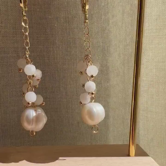Freshwater Pearl Dangle Earrings, Moonstone Cluster Earrings, 14k Gold Earrings, Gemstone Earrings, Bridal Earrings, Anniversary Earrings