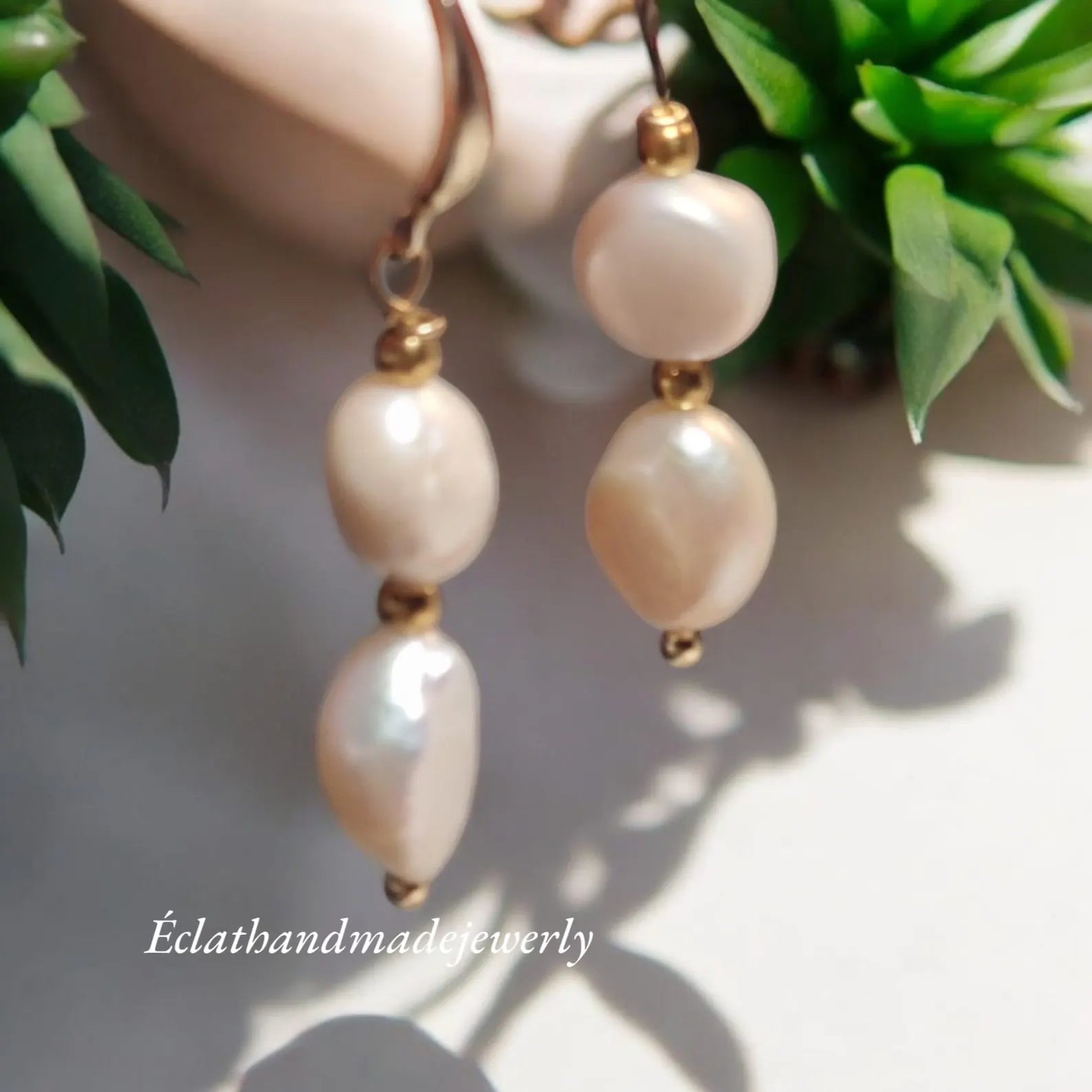 Our freshwater pearl earrings are unique with their iridescent lustre and soft glow. The 14k gold-plated chains and ear wire add a luxurious finish, making these earrings an ideal choice for brides, special events, or everyday elegance.
