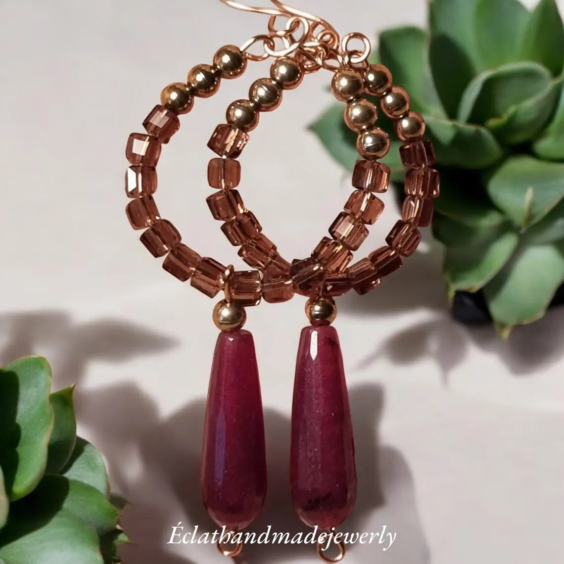 Do you love statement earrings that blend natural beauty with timeless elegance? These smoky quartz burgundy earrings are handcrafted to make you shine. These gemstone earrings feature teardrop smoky quartz stones paired with sparkling crystal glass beads. The warm copper accents add a unique touch, making these earrings ideal for weddings, parties, or adding glamour to your everyday outfits.